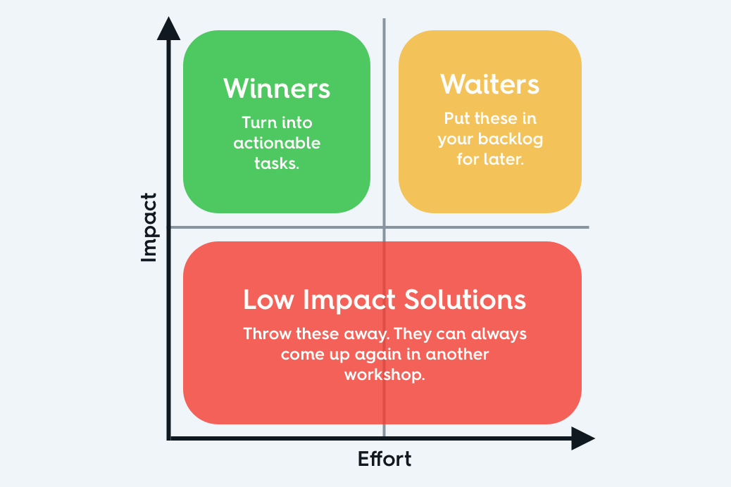 High impact, high effort solutions - known as Waiters - will be put aside and can be added to a task backlog to be addressed or re-prioritised once the Winners have been dealt with.